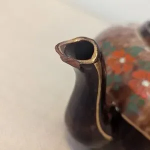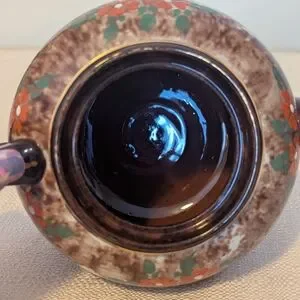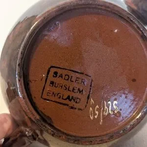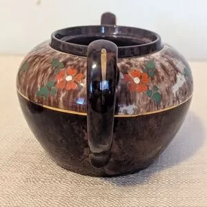 Classic Brown Betty style teapot with a glossy finish. Painted flowers trimmed in gold leaf. This stamp is 1937-1950. James Sadler founded the company 1882 in Burslem, England. They are known for designing the Brown Betty style teapot. There's a small chip on the spout and lid. Some of the gold trim is worn off on the handle. These can be seen in the pictures. It holds 4 cups.