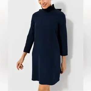 A Tuckernuck style staple, the Daphne is back and better than ever. Our design team spent months perfecting and testing our signature stand collar to get it just right. As Marvin Gaye once said: "Ain't no collar high enough," so bring on the ruffles and drama! Updated in a beautiful stretch crepe fabric, this swing shape mini reminds us of our favorite mod dresses from the 60s and 70s. Ready for al fresco dinners with family, cocktail parties with friends, and every social event on your calendar, the occasions are endless for this bow tie-back number!