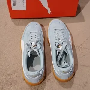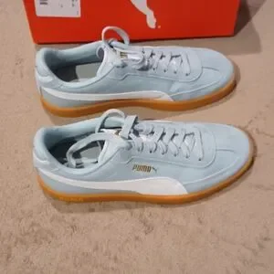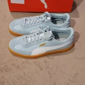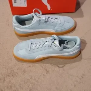 Stylish light blue Puma sneakers featuring a gum sole and white accents. Perfect for casual wear.