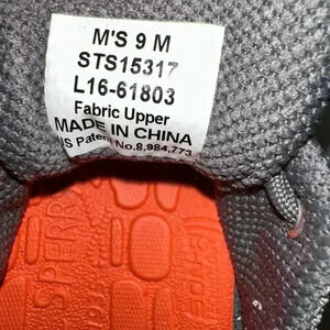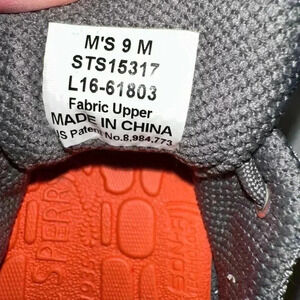 Pre-owned Sperry men's size 9 medium (M's 9 M) STS15317 sneakers. These gray fabric upper shoes feature orange accents on the heel and insole. The sole is off-white. The shoes have a lace-up closure. Made in China (L16-61803). Minor wear is visible; otherwise, they are in good condition. The insole shows the brand name and "Since 1935." The shoes measure approximately 11 inches in length and 4 inches in width. The fabric shows some slight pilling.
