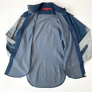 An iconic piece of fashion history. This shirt features a large scale print of Marlene Dietrich that spans the back, sides, and sleeve, in indigo blue chambray. Classic Westwood Orb engraved buttons at collar and cuffs. Light orange buttons fasten the button up front. Pointed dagger collar. Rounded hemline that rises at the sides.