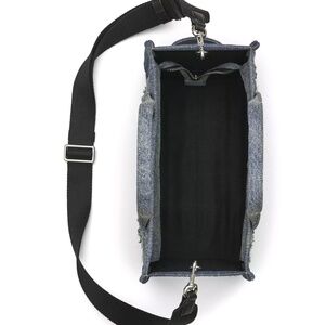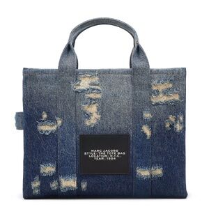 An iconic Marc Jacobs silhouette, this medium tote reimagined in artfully distressed structured denim features signature embroidered namesake branding and a chunky top-zip closure. A everyday essential, carry by denim top handle or attach adjustable webbing strap for effortless crossbody styling.