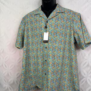 Quieti Performance Button Down Floral Short Sleeve Blue Shirt NWT