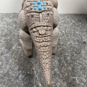 Head and neck moves when you crank is tail. Doesn’t have mini dinosaur