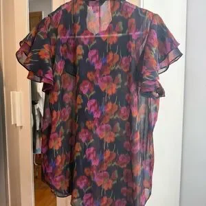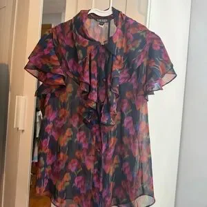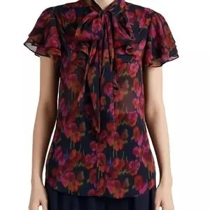 Chic floral blouse with ruffle sleeves. Features a stylish bow tie. Perfect for any occasion.
