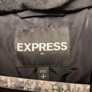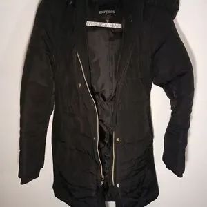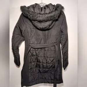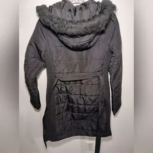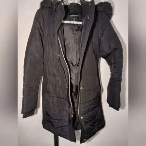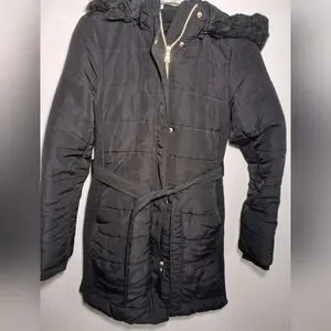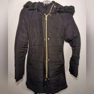 Elegant black puffer coat. Gold zipper and buttons. Hood with faux fur trim.