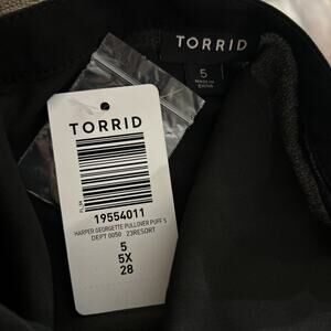 The Torrid Top in size 5X is a deep black georgette blouse with puff sleeves, perfect for a peasant, witchy, or boho style. This flowy top features a split neckline and button accents, making it versatile for occasions like travel, parties, or casual wear. Made from lightweight and stretchy polyester material, this blouse is machine washable for easy care. It has a regular fit and is part of the Torrid brand, catering to plus-sized women with a bohemian or elegant theme, suitable for various seasons like winter, summer, fall, and spring.