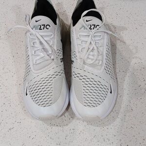 cleaned up all white with black axents Nike Air Max 270 with a modern design. Features white mesh upper and Includes signature air unit for comfort they have ben worn once basically brand new