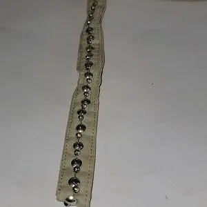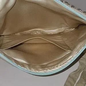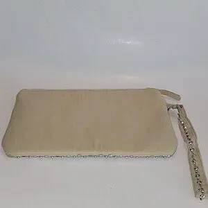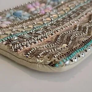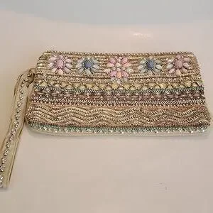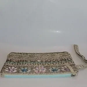 Charlie Paige bead and sequin embellished wristlet with a non detachable wristlet strap. Features top zip closure. The interior has a backwall open slip pocket. Fabric content: Shell is 100% shimmery cotton, and lining is 100% polyester. Lightly padded. Pre-owned and in excellent condition. From a smoke-free and pet free home.