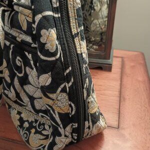 Practical Vera Bradley bag in the bowler style with top handles.There are pockets galore on this bag, a large zipped pocket on the outside, goes across the bag, then there are two flap style pockets on the other side, with magnet style closures. Inside there are three slip ins and another zipped big pocket all across the opposite side. Then the bag is fastened by a zip going all the way on the outside, two zip pulls that meet at the top, with a gusset on the inside to hold your stuff in as you zip the purse open to look for that elusive tube of lipstick!