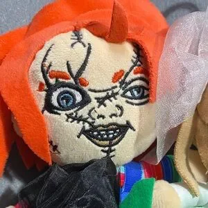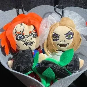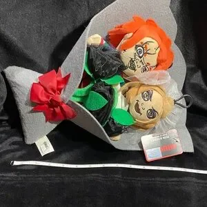 Celebrate the holidays with this unique Chucky and Tiffany plush bouquet. This is a Chucky & Tiffany Plush Bouquet, a unique Valentine's gift or Halloween decoration inspired by the iconic Child's Play movies. This set includes plush versions of Chucky and Tiffany, along with soft, removable roses. The bouquet is wrapped in gray felt and features a striking red bow. Each plush piece is meticulously detailed and can double as a fun home decoration. It's crafted with soft, high-quality materials and can be found in a themed box for presentation. This plush bouquet offers a playful yet eerie alternative to traditional Valentine's Day gifts, perfect for fans of horror and gothic romance.