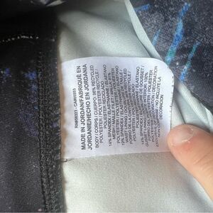 Stylish leggings featuring an abstract print with black panels. Perfect for workouts or casual wear.
