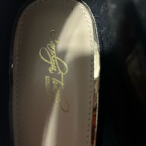 Chic black suede loafers with gold accents. Perfect for a stylish look.
