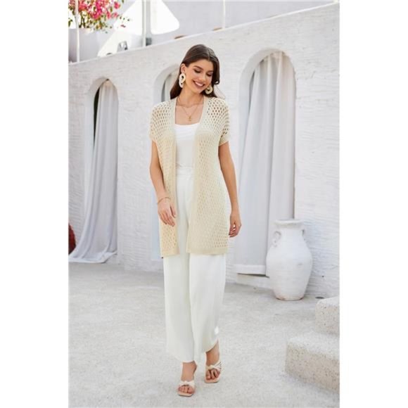 *【Features】Trendy crochet long cardigan, Fashionable hollowed-out textured, Open-front cardigan, Side slit, Short sleeve sweater, Ribbed hemline, Loose fit, Soft knitted fabric, Lightweight, Ribbed v-neck, Boho style, Sheer tops, Causal mesh shirt, Beach cover-ups.