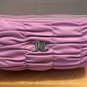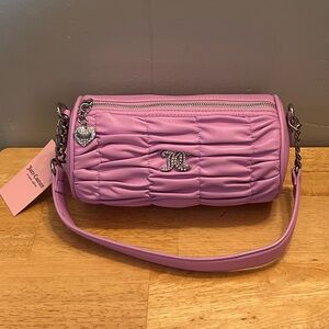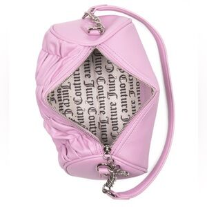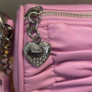 Chic pink barrel shoulder bag with ruched design, logo plate with rhinestone accents and heart zipper charm. Beautiful pink color. Spacious interior with logo pattern in interior fabric. Features sparkling logo and sparkling heart zipper charm. Bag has a top carry handle shoulder strap with chain accents. The heart charm is SO cute. Bag measuress 9in W x 5in H. Spacious interior has 1 interior slip pocket and1 interior zip pocket. Bag has full zip closure. Made by Juicy Couture. Brand new with tags.