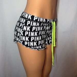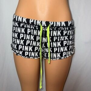 Stylish black and white shorts featuring PINK logo. Neon drawstring adds a pop of color. Black and white vs pink lounge shorts featuring a monogram print design along with a neon yellow drawstring. Has a back butt pocket. SIZE:small DIMENSIONS APROX waist:16 length:7 inseam:1 OPEN TO OFFERS!