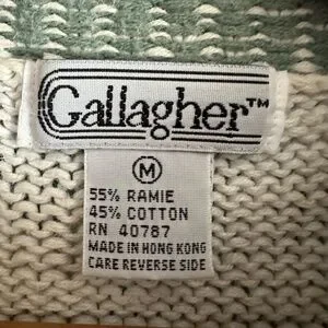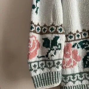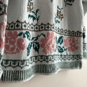Description: Vintage Gallagher sweater with a unique floral rose pattern and striped hemlines. Ramie/cotton blend.