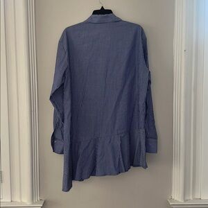 Chic striped blue and white blouse by Veronica Beard. Features button-down front and classic collar with an asymmetrical peplum style hem.