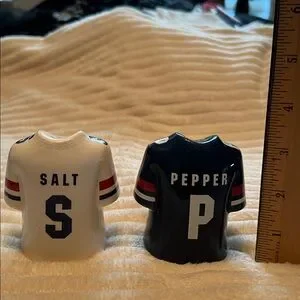 Set of NY Giants jersey-shaped salt and pepper shakers. Features white and blue colors with team logo.