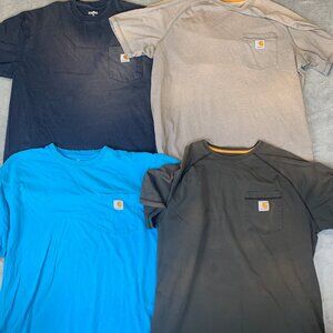 Bundle of SEVEN Carhartt men’s short sleeve t-shirts in size Large. Mixed styles including classic K87 original fit and Carhartt Force performance pocket tees. Colors include navy, gray, black, and blue. Shirts show heavy use from jobsite and workwear environments but remain wearable. Great option for work, painting, yard work, or shop use.