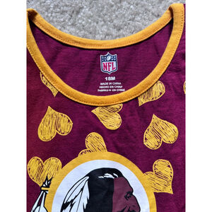 This pre-owned NFL Redskins baby set, size 18 months, includes a dress and a bloomer. The dress features a maroon top with yellow trim, puffed sleeves, yellow heart patterns, and a central Native American profile logo. Its skirt is a multi-layered, ruffled orange tulle. The accompanying maroon bloomer has an elasticated waist and leg openings, made from a mesh-textured fabric. Both items show light wear, consistent with pre-owned condition; the NFL brand is visible on the dress tag.