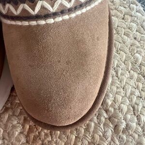 Cozy sheepskin mules with plush lining. Stylish zigzag detail. Durable sole for everyday wear. Gently worn but see minor signs of wear on front and sheepskin border (see all pics and small stain that could come out with spot treatment) Sold out everywhere! Going for over $150+ on eBay.