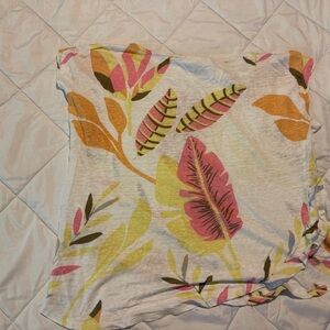 This Cynthia Rowley blouse features a relaxed fit with a vibrant graphic design in cream and yellow tones. The top showcases a nature-inspired aesthetic with large botanical elements and decorative leaf patterns, perfect for a casual yet stylish look.