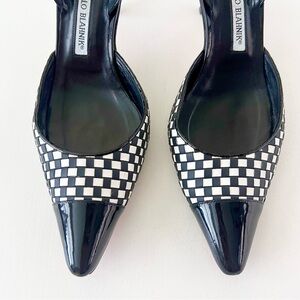 MANOLO BLAHNIK | Black White Cap Toe Woven Leather SlingBack Pointed Pumps