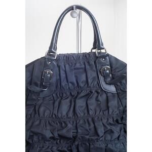 Lightweight yet luxurious, this ruched tote balances everyday function with elevated design. The gathered nylon texture, classic black hue, and optional shoulder strap make it a versatile choice for work or travel.