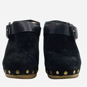 VERONICA BEARD Dacey Clogs Buckled Strap Studded Black Suede Wooden Heel Mule