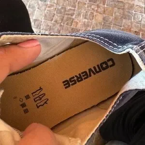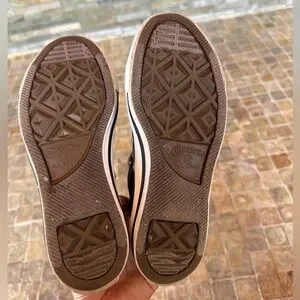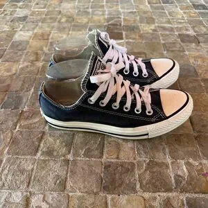 Sleek black Converse low tops. White laces and rubber soles. Iconic style.