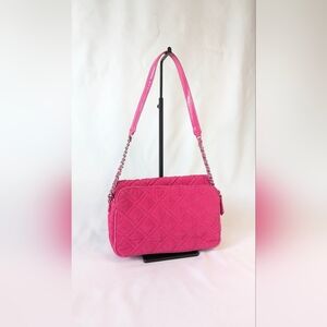 Vera Bradley quilted shoulder bag in a vibrant hot pink color. Bottom is patent leather for better durability. Similarly, the shoulder strap is part patent leather and part chain. Multiple compartments, magnetic and zipper closures.
