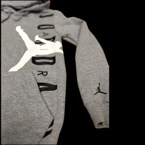Comfortable gray tracksuit featuring the iconic Jordan logo. Includes hoodie and sweatpants.