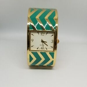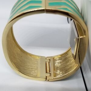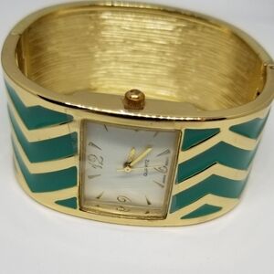Bold teal and goldtone fashion bracelet watch. Hinged closure. No battery.