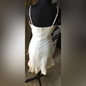 Chic cream dress with a high low hem. Features a ruffled edge and sleek design. Perfect for elegant occasions.