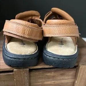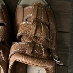 Comfortable leather sandals with secure buckle. Perfect for everyday wear. Excellent condition, I don’t think they have ever been worn. Really nice soft leather. Adjustable buckle and Velcro straps to get the fit just right.