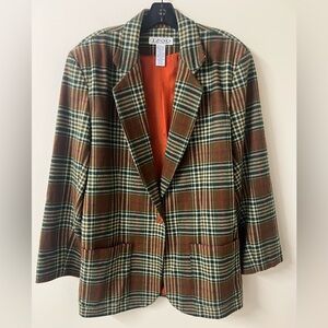 Izod blazer with a multicolor plaid pattern. Features a vibrant orange lining. Ideal for a bold statement. If Hermoine was in Slytherin, this would be her blazer!