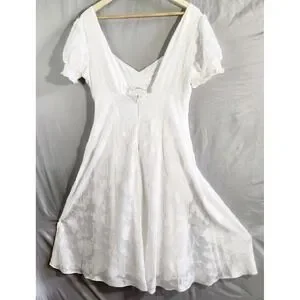 This Adrianna Papell Lace Dress in Ivory is a stunning piece featuring a boho embroidered overlay with large floral lace detailing. The dress has a fit & flare style with a midi length, making it suitable for various occasions such as weddings, parties, or formal events. The dress is lined, backless, and collarless, with sheer fabric that adds a touch of elegance. With puff sleeves, a scoop neckline, and a zipper closure, this dress offers a princessy and bohemian vibe, perfect for the summer, fall, or spring seasons. Made from a blend of polyester and cotton, this dress is a stylish and sophisticated choice for any woman's wardrobe.