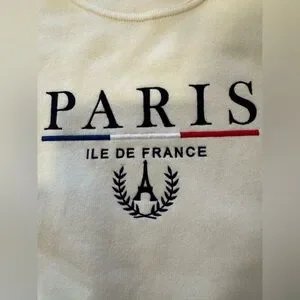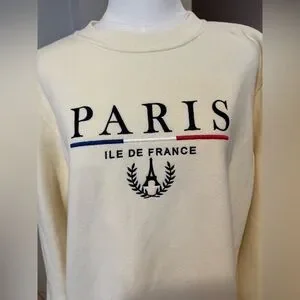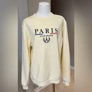 Stay comfortable and cozy in this butter yellow Paris Ile De France sweatshirt from Paris Tour D’or. Crewneck style with ribbed texture that matches the sleeve cuffs and bottom hemline. Super soft and buttery. Made of 50% cotton & 50% polyester. Embroidered lettering and details are in colors navy blue, red, & white. Perfect to throw on with a pair of jeans or cozy up on a casual day or lounge around in.