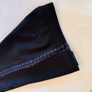 Sleek black pants with subtle blue wool tweed side accents. Straight leg design. Perfect for versatile styling.