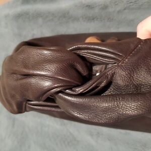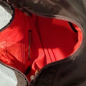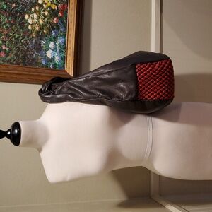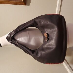 Unique shoulder bag from Tissa Fontaneda. Handmade in Spain from ethically sourced leathers. Company strives to be a no waste brand and uses no forever plastics. Ultra soft very dark brown leather with red leather bubble stripe. Bag is very lightweight but very well made. Condition is perfect.