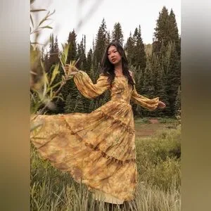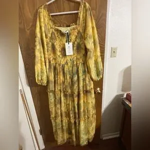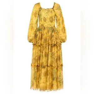 Charming maxi dress with sunflower print. Features long sleeves and tiered skirt.