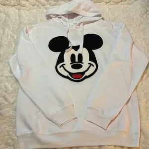NWT Disney Mickey Mouse fleece hoodie, white in color with sewn on textured graphic on Disney tag, kangaroo pocket, drawstring hoodie, 22” PTP, 26” Length, 60% Cotton, 40% Polyester, brand new condition, smoke free home