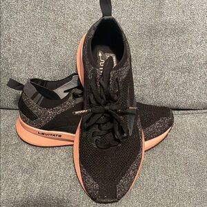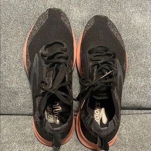 Stylish Brooks Levitate shoes. Black mesh upper. Pink sole for contrast. Perfect for running.