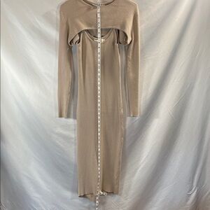 Elevate your wardrobe with this chic long sleeve beige knit dress. Perfect for any occasion, it combines comfort with style. Item has been gently worn/used, item has minimal signs of wear, no rips, tears or stains.