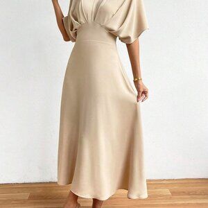 This Women's Polyester V Neck Half Sleeve Ruched Long Dress is a perfect go-to for almost any occasion. The soft apricot color and flared hem give it a feminine, breezy vibe, while the ruched details add a touch of stylish flair. The V-neck and batwing sleeves bring a relaxed yet polished look, and the zipper closure makes it easy on and off. Great for parties, beach trips, date nights, seaside vacations, or just elevating your everyday style. Feel fabulous and comfortable all day long!