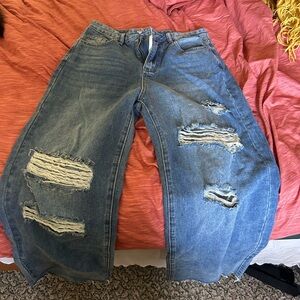 Trendy wide leg jeans with a distressed look. Light blue color. Perfect for casual wear.