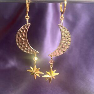 Embrace the magic of the night sky with these enchanting crescent moon and star dangle earrings. Each earring features a hammered gold-tone crescent moon with a sparkling Swarovski crystal bead that catches the light beautifully, leading to a radiant gold star charm. Lightweight and eye-catching, these earrings bring a touch of celestial elegance to any outfit.