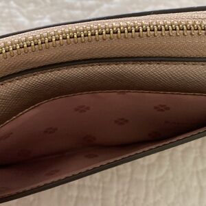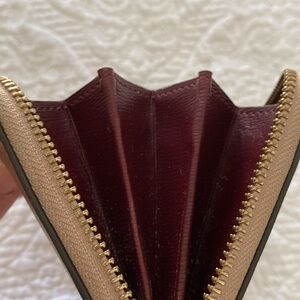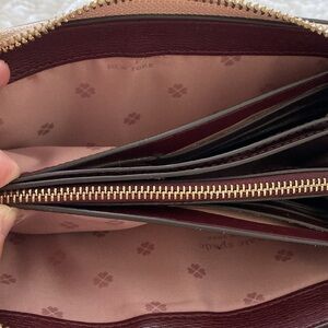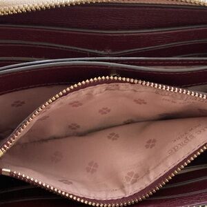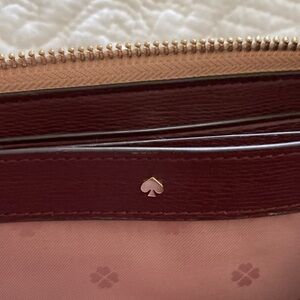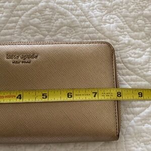 Kate Spade large gold metallic zip around wallet w/ cranberry and pink interior. Excellent condition with only flaw being scuffs on interior accordion folds on one side as shown.