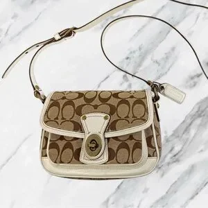Stylish Coach crossbody bag. Features signature pattern. Elegant turn-lock closure. Perfect for everyday use.
